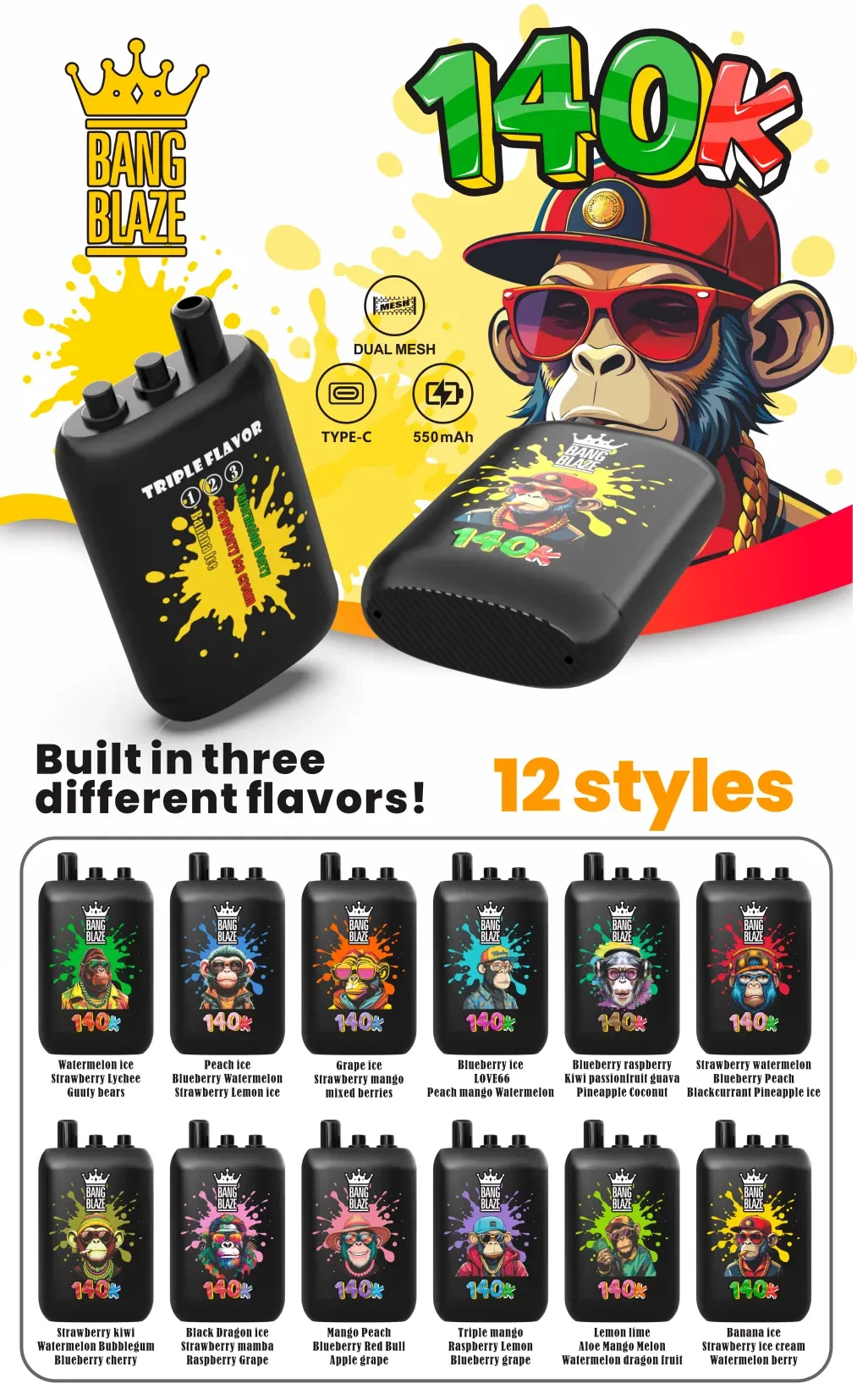 Bang Blaze 140000 140K パフ 3in1 3 ピュアフレーバー使い捨てベープ – 0% 2% 3% 5%ニコチンオプション 12種類のフレーバー 卸売向け